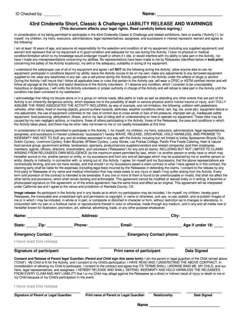 Name: ID Checked by: 43rd Cinderella Short, Classic & Challenge LIABILITY RELEASE AND WARNINGS (This document affects your legal rights. Read carefully before signing.) In consideration of my being