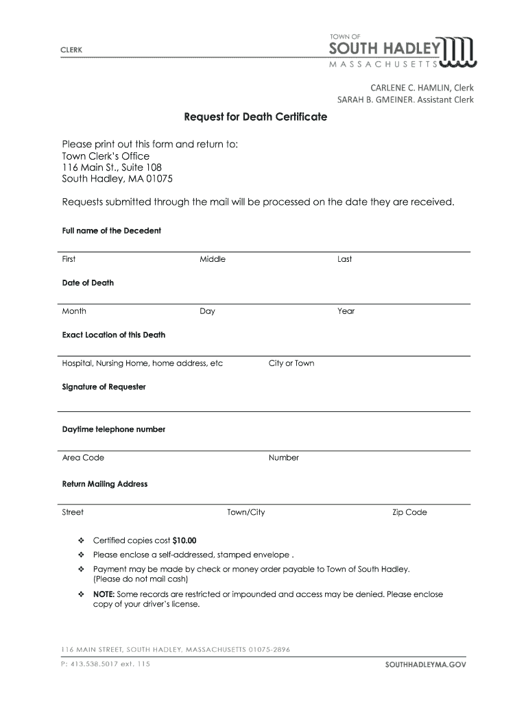 SARAH B. MINER, Assistant ClerkRequest for Death Certificate