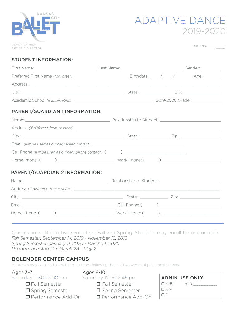 ADAPTIVE DANCE20192020 Office Only enrollment dateSTUDENT INFORMATION: First Name: Last Name: Gender: Preferred First Name (for roster): Birthdate: / / Age: Address: City: State: Zip: Academic School