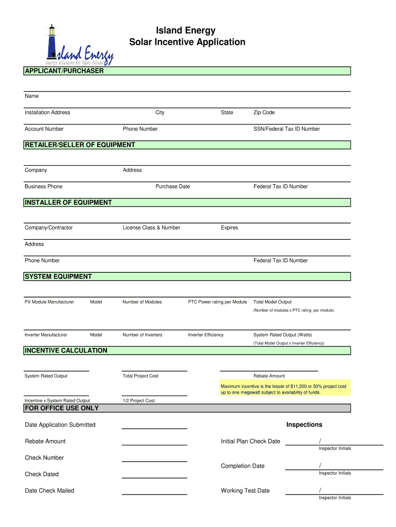 Island Energy Solar Incentive Application APPLICANT/PURCHASERName Installation AddressCityAccount NumberStatePhone Number Code SSN/Federal Tax ID NumberRETAILER/SELLER OF EQUIPMENTCompanyAddressBusiness