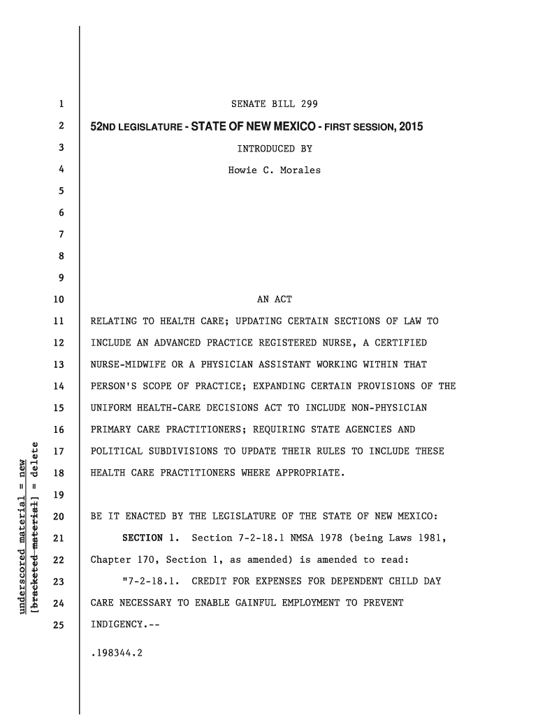 SENATE BILL 2991 252ND LEGISLATURE STATE OF NEW MEXICO FIRST SESSION, 20153INTRODUCED BY4Howie C. Morales5 6 7 8 9 AN ACT underscored material new bracketed material delete10 11RELATING TO HEALTH