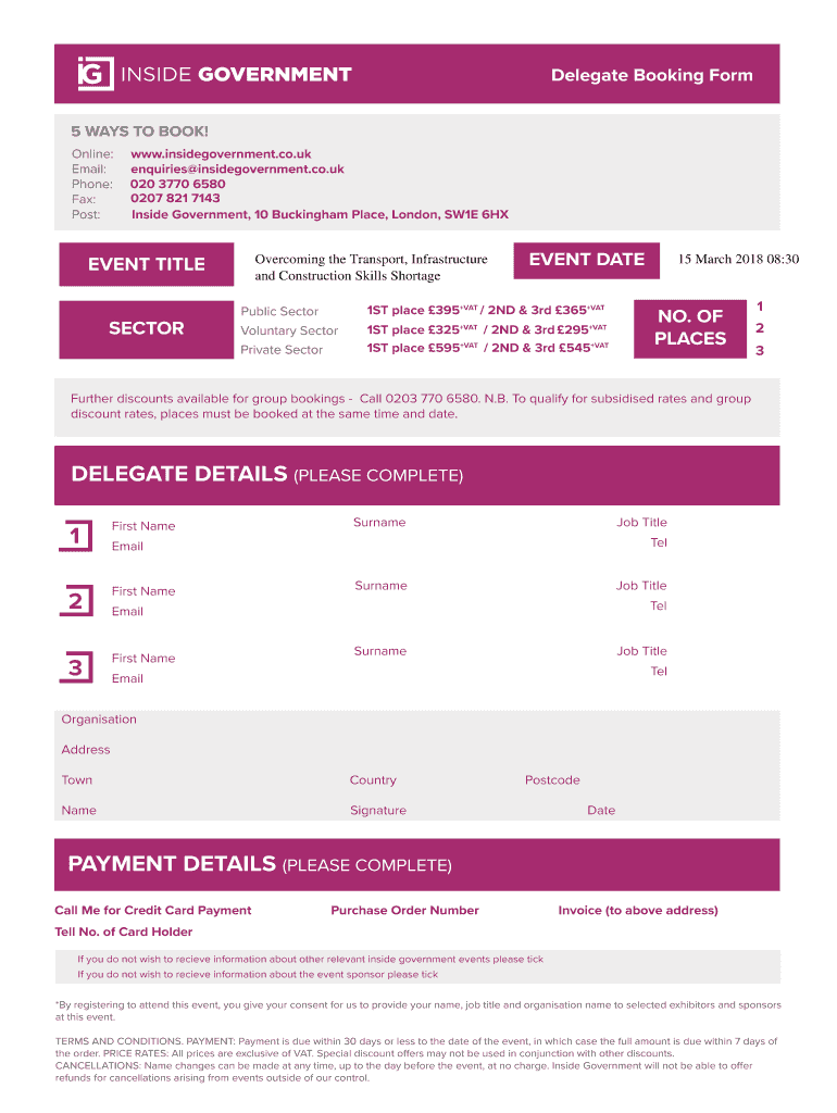 Delegate Booking Form 5 WAYS TO BOOK! Online: Email: Phone: Fax: Post:www.insidegovernment.co.uk inquiries inside government.co.UK 020 3770 6580 0207 821 7143 Inside Government, 10 Buckingham Place,