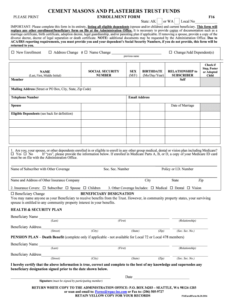 CEMENT MASONS AND PLASTERERS TRUST FUNDS ENROLLMENT FORMULAS Prostate: AKF16 Local Now or IMPORTANT: Please complete this form in its entirety, listing all eligible dependents (spouse and/or children)