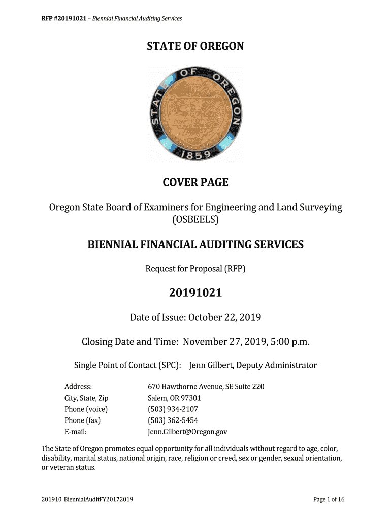 RFP #20191021 Biennial Financial Auditing ServicesSTATE OF OREGONCOVER PAGE Oregon State Board of Examiners for Engineering and Land Surveying (STEELS)BIENNIAL FINANCIAL AUDITING SERVICES Request
