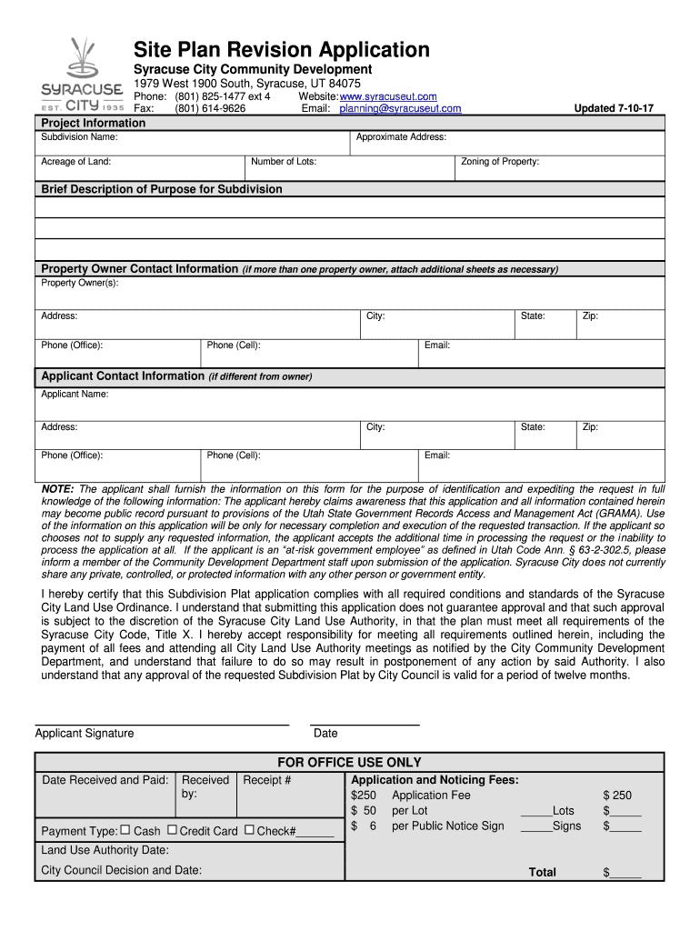 Submit the completed application form and supporting documents either online or in person, as specified by the Syracuse City government.