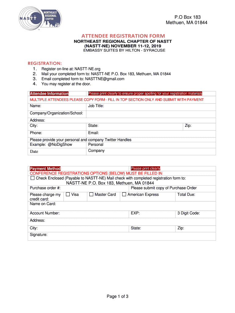 P. O Box 183 Methuen, MA 01844ATTENDEE REGISTRATION FORM NORTHEAST REGIONAL CHAPTER OF NASTY (BATTLE) NOVEMBER 1112, 2019 EMBASSY SUITES BY HILTON SYRACUSEREGISTRATION: 1. Register online at: BATTLE.org