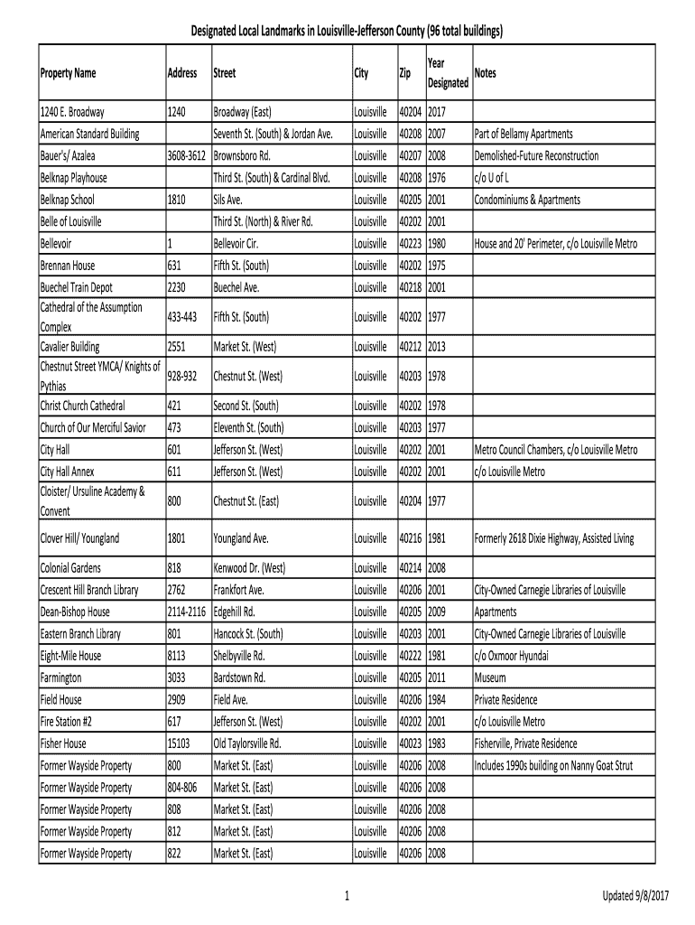 Designated Local Landmarks in Louisville Jefferson County (96 total buildings) CityZipYear Notes Designated Broadway (East) Seventh St. (South) & Jordan Ave. 36083612 Brownsburg Rd. Third St. (South)