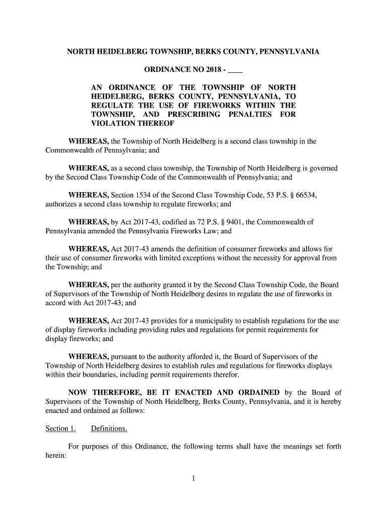 NORTH HEIDELBERG TOWNSHIP, BERKS COUNTY, PENNSYLVANIA ORDINANCE NO 2018 AN ORDINANCE OF THE TOWNSHIP OF NORTH HEIDELBERG, BERKS COUNTY, PENNSYLVANIA, TO REGULATE THE USE OF FIREWORKS WITHIN THE TOWNSHIP,