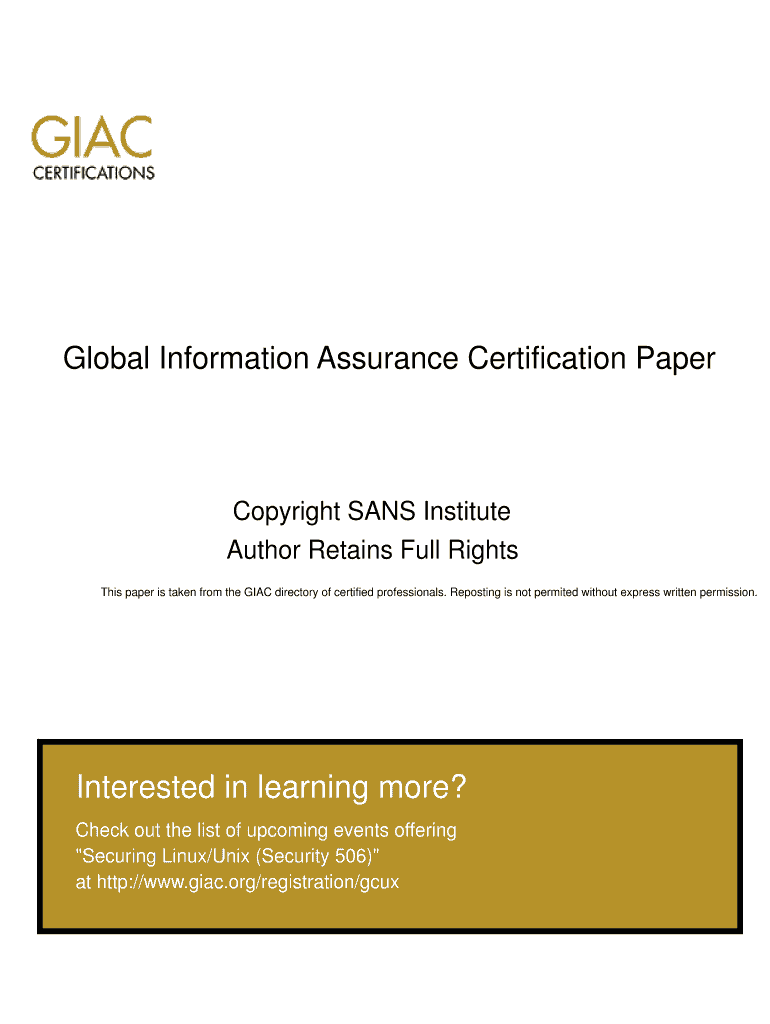 Global Information Assurance Certification PaperCopyright SANS Institute Author Retains Full Rights This paper is taken from the GMAC directory of certified professionals. Reposting is not permitted
