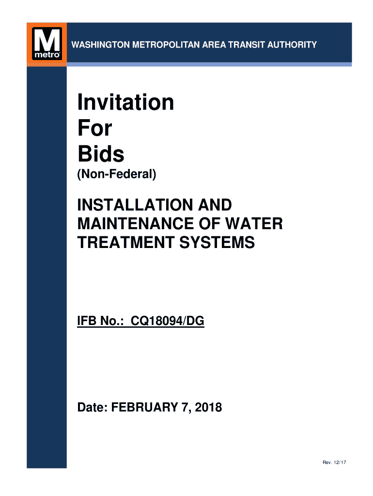 WASHINGTON METROPOLITAN AREA TRANSIT AUTHORITYInvitation For Bids (Confederal)INSTALLATION AND MAINTENANCE OF WATER TREATMENT SYSTEMS No.: CQ18094/DGD ate: FEBRUARY 7, 2018Rev. 12/17Table of Contents
