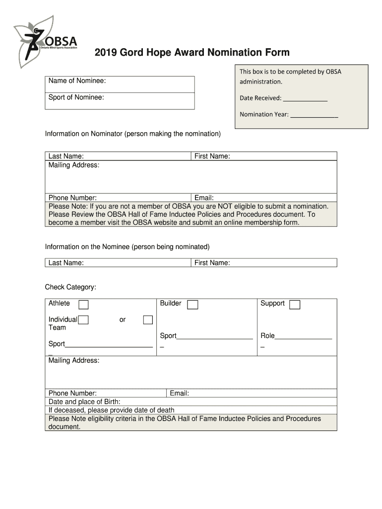 Get the free 2019 Gord Hope Award Nomination Form - blindsports.on.ca