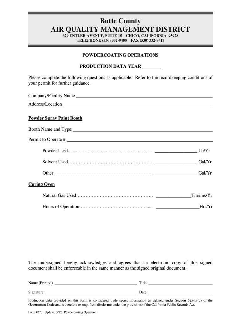 Butte County AIR QUALITY MANAGEMENT DISTRICT 629 ENTER AVENUE, SUITE 15 CHICO, CALIFORNIA 95928 TELEPHONE (530) 3329400 FAX (530) 3329417POWDERCOATING OPERATIONS PRODUCTION DATA YEAR Please complete