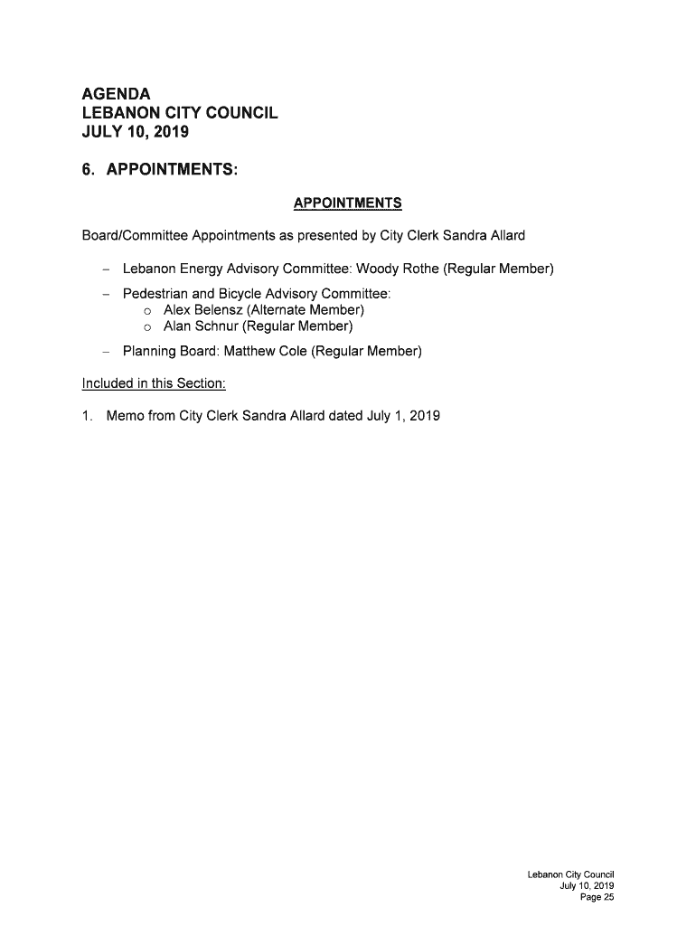 AGENDA LEBANON CITY COUNCIL JULY 10, 2019 6. APPOINTMENTS: APPOINTMENTS Board/Committee Appointments as presented by City Clerk Sandra Ballard Lebanon Energy Advisory Committee: Woody Roth (Regular