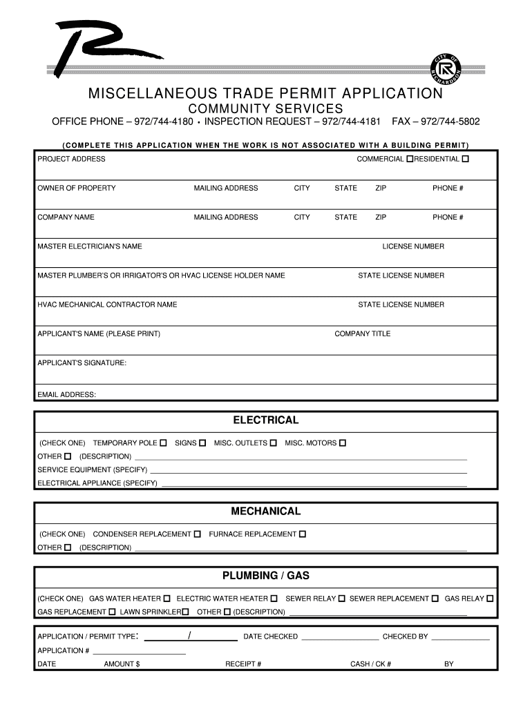 MISCELLANEOUS TRADE PERMIT APPLICATION COMMUNITY SERVICES OFFICE PHONE 972/7444180 INSPECTION REQUEST 972/7444181FAX 972/7445802(C O M P L E T E T H I S AP P L I C AT I O N W H E N T H E W O R K I