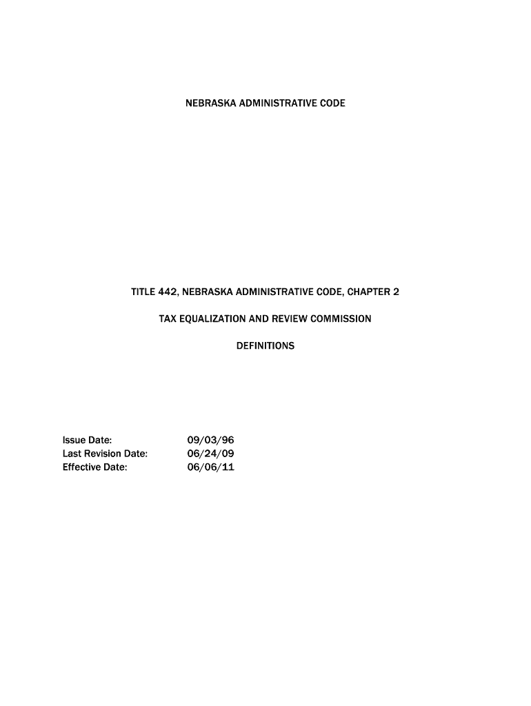 NEBRASKA ADMINISTRATIVE COLETTE 442, NEBRASKA ADMINISTRATIVE CODE, CHAPTER 2 TAX EQUALIZATION AND REVIEW COMMISSION DEFINITIONSIssue Date: Last Revision Date: Effective Date:09/03/96 06/24/09 06/06/11NEBRASKA