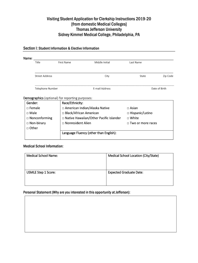 Visiting Student Application for Clerkship Instructions 201920 from domestic Medical Colleges Thomas Jefferson University Sidney Kimmel Medical College, Philadelphia, PA Section I: Student Information