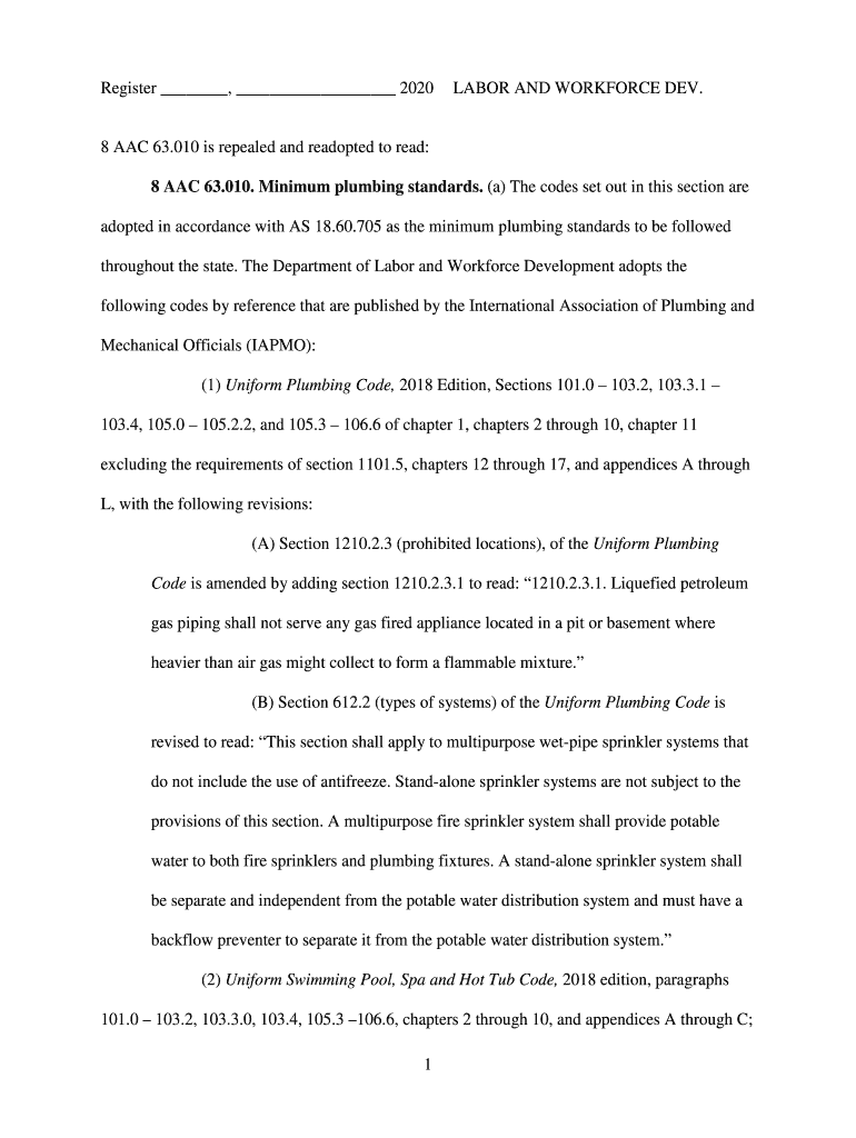 Register, 2020LABOR AND WORKFORCE DEV.8 AAC 63.010 is repealed and readopted to read: 8 AAC 63.010. Minimum plumbing standards. (a) The codes set out in this section are adopted in accordance with
