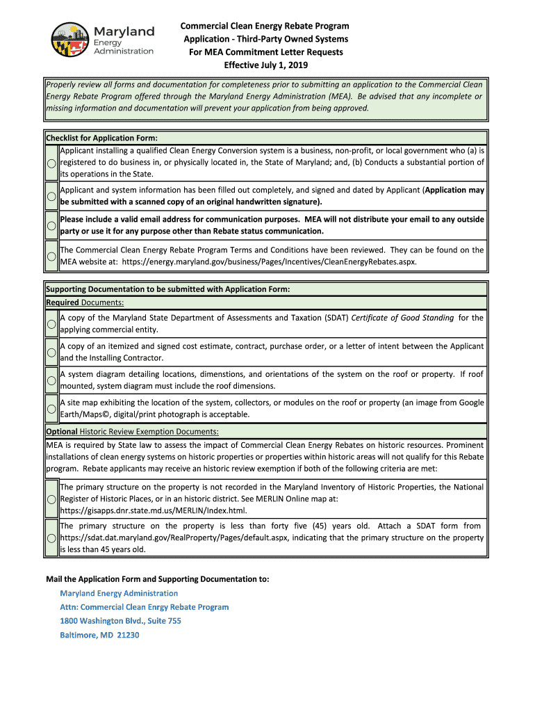 Commercial Clean Energy Rebate Program Application ThirdParty Owned Systems For MEA Commitment Letter Requests Effective July 1, 2019, Properly review all forms and documentation for completeness