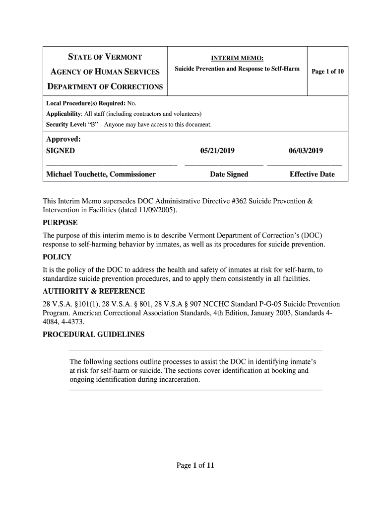 STATE OF VERMONTINTERIM MEMO:AGENCY OF HUMAN SERVICESSuicide Prevention and Response to SelfHarmPage 1 of 10DEPARTMENT OF CORRECTIONS Local Procedure(s) Required: No. Applicability: All staff (including