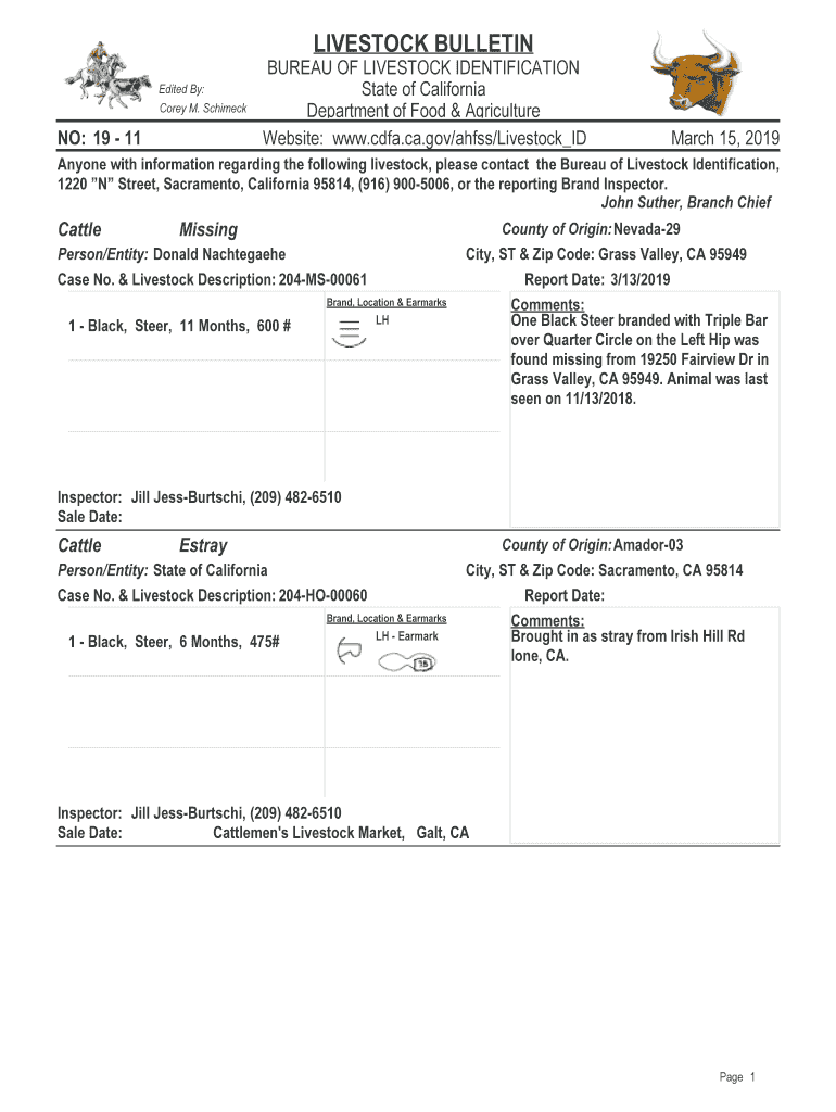 LIVESTOCK BULLETIN Edited By: Corey M. SchimeckNO: 19 11BUREAU OF LIVESTOCK IDENTIFICATION State of California Department of Food & Agriculture Website: www.cdfa.ca.gov/ahfss/Livestock ID March 15,