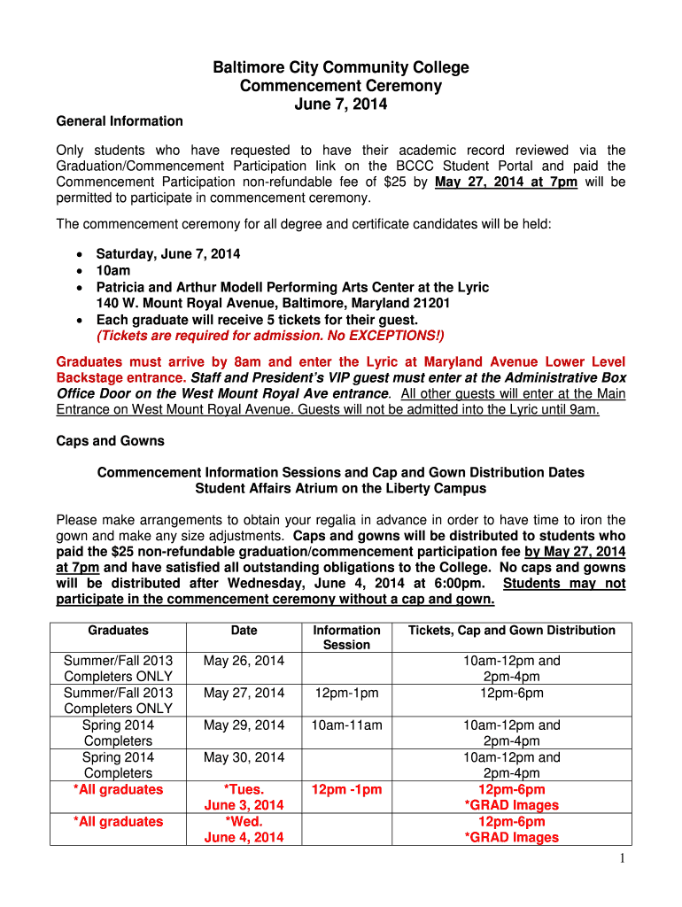 Baltimore City Community College Commencement Ceremony June 7, 2014, General Information Only students who have requested to have their academic record reviewed via the Graduation/Commencement Participation