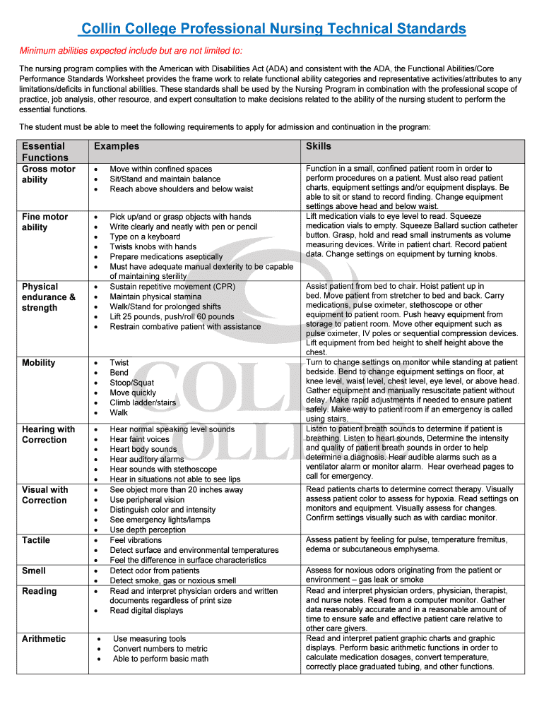 Collin College Professional Nursing Technical StandardsMinimum abilities expected include but are not limited to: