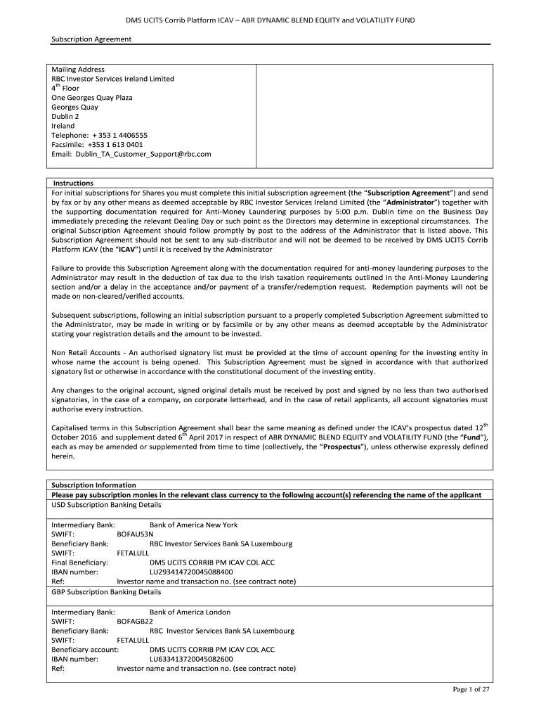 DMS UNITS Corrie Platform CAV ABR DYNAMIC BLEND EQUITY and VOLATILITY FUND Subscription AgreementMailing Address RBC Investor Services Ireland Limited TH 4 Floor One Georges Quay Plaza Georges Quay