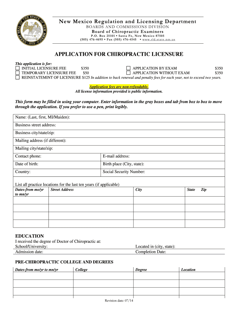 New Mexico Regulation and Licensing Department B O ARD S AND C O MM IS S I ONS D IV I SI Onboard of Chiropractic Examiners P.O. Box 251 0 1 S a NT an F e, New M ex i c o 8 7 50 5 (5 0 5) 4 7 6 4 6