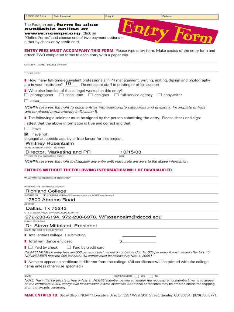 OFFICE USE Validate Received:Entry #:ENTRY Division:north Paragon entry form is also available online at www.ncmpr.org. Click on Online Forms and choose one of two payment options either by check