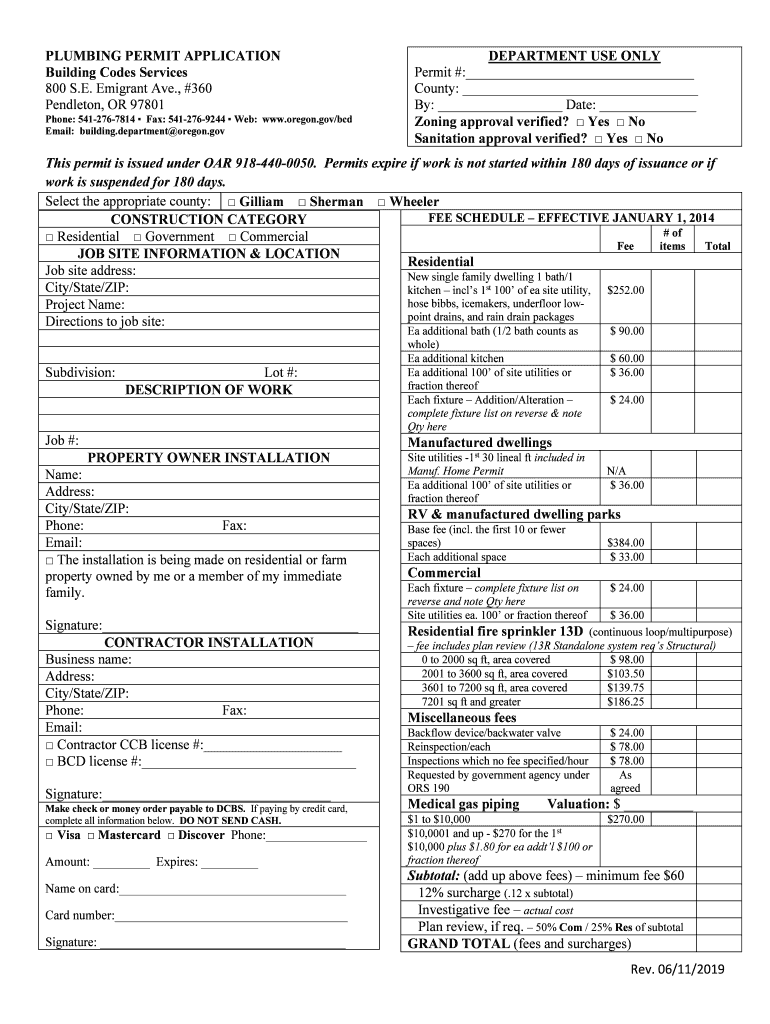 PLUMBING PERMIT APPLICATION Building Codes Services 800 S.E. Emigrant Ave., #360 Pendleton, OR 97801Phone: 5412767814 Fax: 5412769244 Web: www.oregon.gov/bcd Email: building. Department Oregon. Department