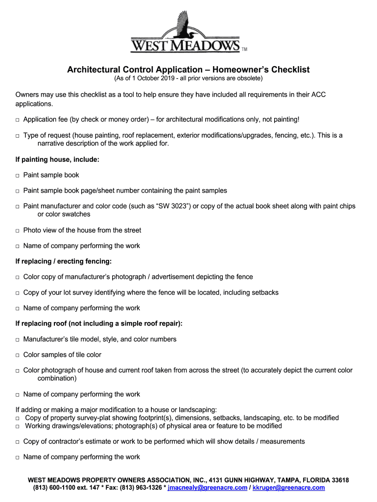 Architectural Control Application Homeowners Checklist (As of 1 October 2019 all prior versions are obsolete)Owners may use this checklist as a tool to help ensure they have included all requirements
