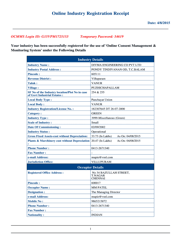 Online Industry Registration Receipt