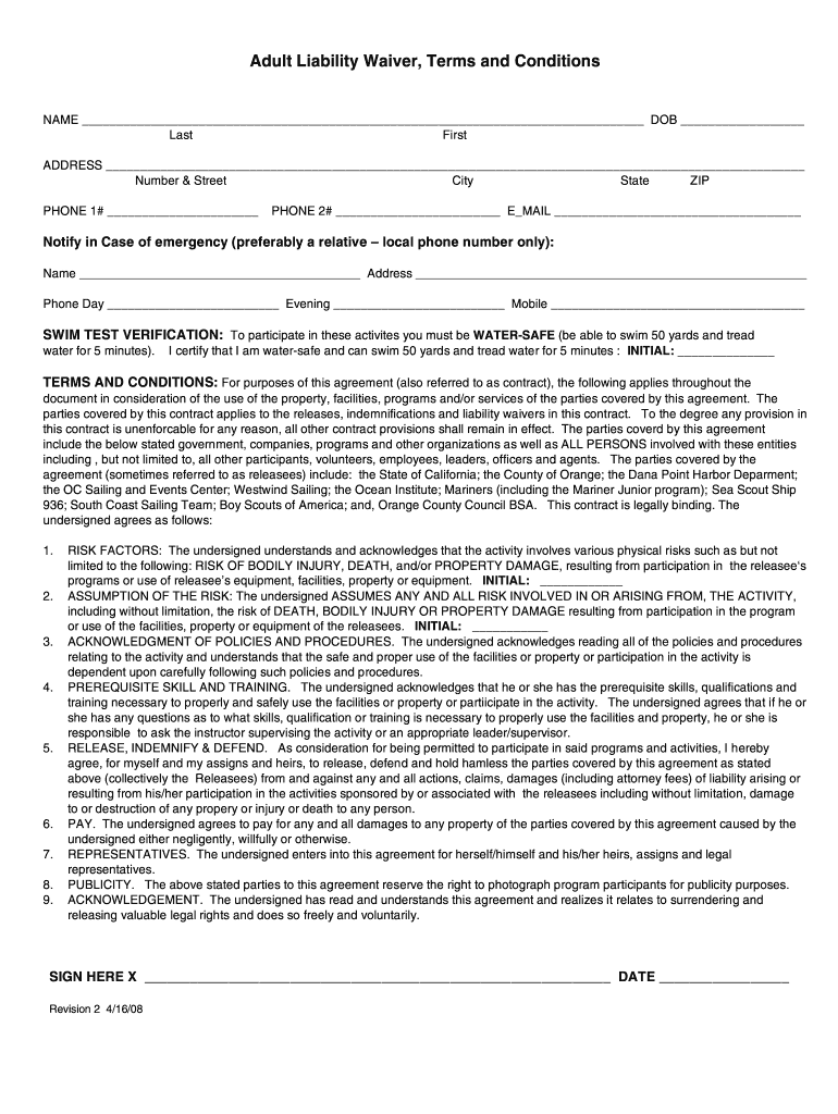 Adult Liability Waiver, Terms and ConditionsNAME DOB Last First ADDRESS Number & Street City State ZIP PHONE 1# PHONE 2× E MAIL Notify in Case of emergency (preferably a relative local phone number