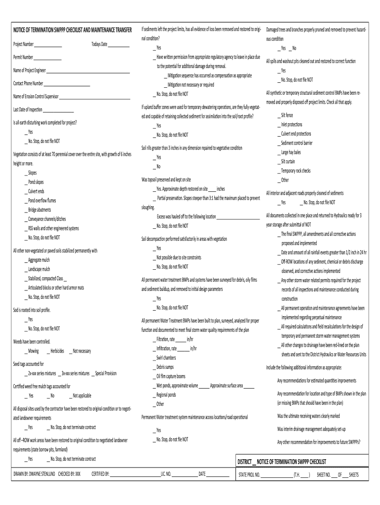 NOTICEOFTERMINATIONSWPPPCHECKLISTANDMAINTENANCETRANSFER ProjectNumber TodaysDate PermitNumber NameofProjectEngineer ContactPhoneNumber NameofErosionControlSupervisor Ifuplandbuerzoneswereusedfortemporarydewateringopera