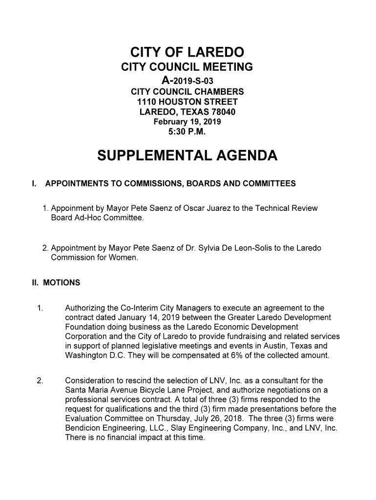 CITY OF LAREDO CITY COUNCIL MEETING A2019S03 CITY COUNCIL CHAMBERS 1110 HOUSTON STREET LAREDO, TEXAS 78040 February 19, 20195:30 P.M.SUPPLEMENTAL AGENDA I. APPOINTMENTS TO COMMISSIONS, BOARDS AND