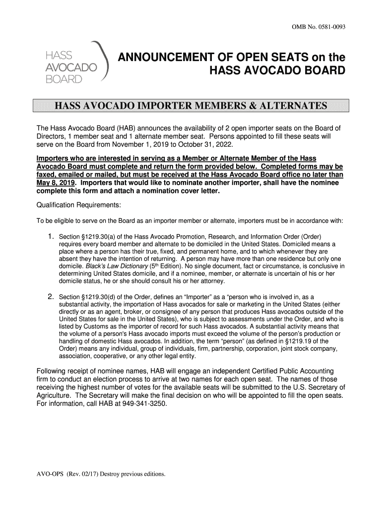 OMB No. 05810093ANNOUNCEMENT OF OPEN SEATS on the HAS AVOCADO BOARD HAS AVOCADO IMPORTER MEMBERS & ALTERNATES The Has Avocado Board (HAD) announces the availability of 2 open importer seats on the