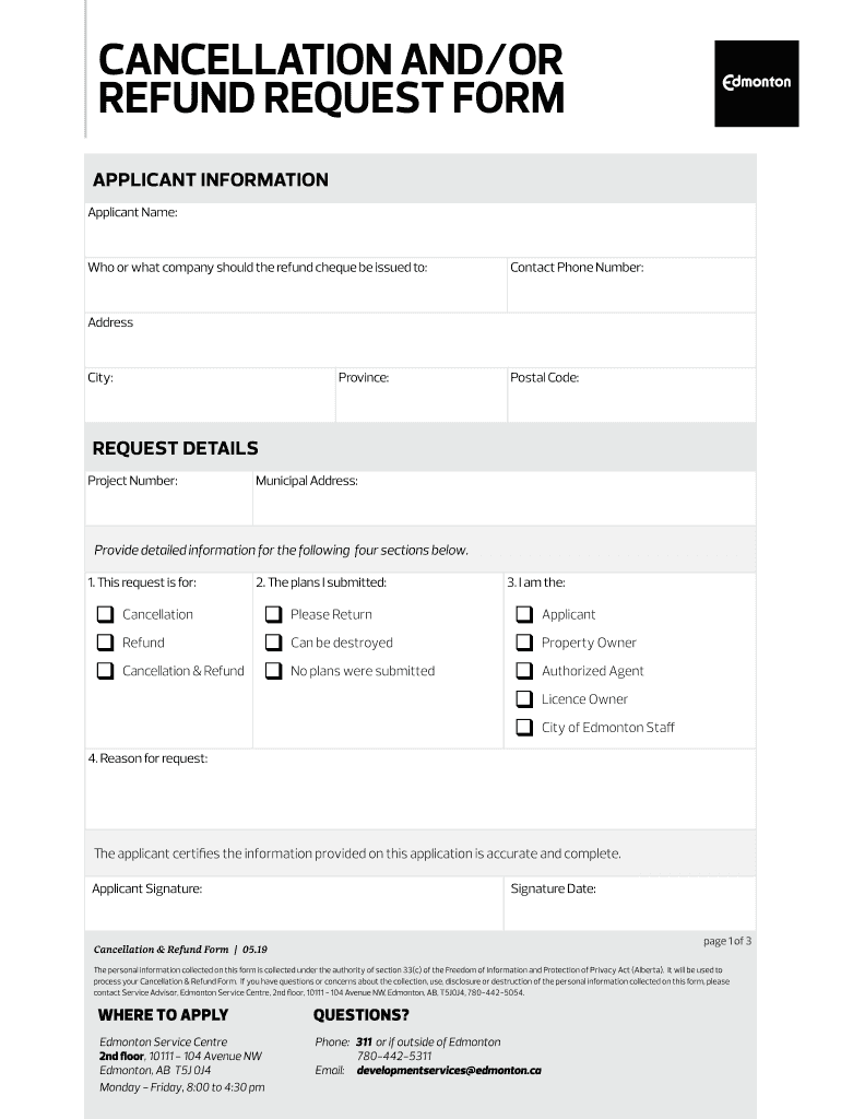 CANCELLATION AND/OR REFUND REQUEST FORM applicant informationPRINTApplicant Name:Who or what company should the refund check be issued to:Contact Phone Number:Addressing:Province:Postal Code:request