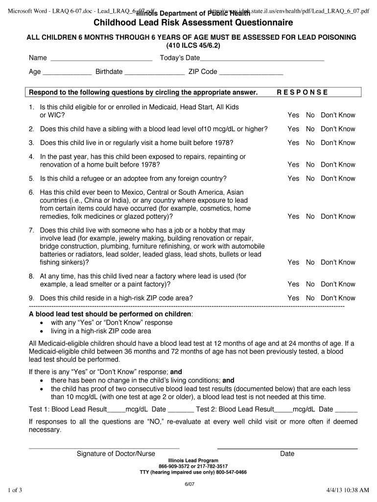 Microsoft Word IRAQ 607.doc Lead IRAQ 6 07.pdf http://www.idph.state.il.us/envhealth/pdf/Lead IRAQ 6 07.pdf Illinois Department of Public HealthChildhood Lead Risk Assessment Questionnaire ALL CHILDREN