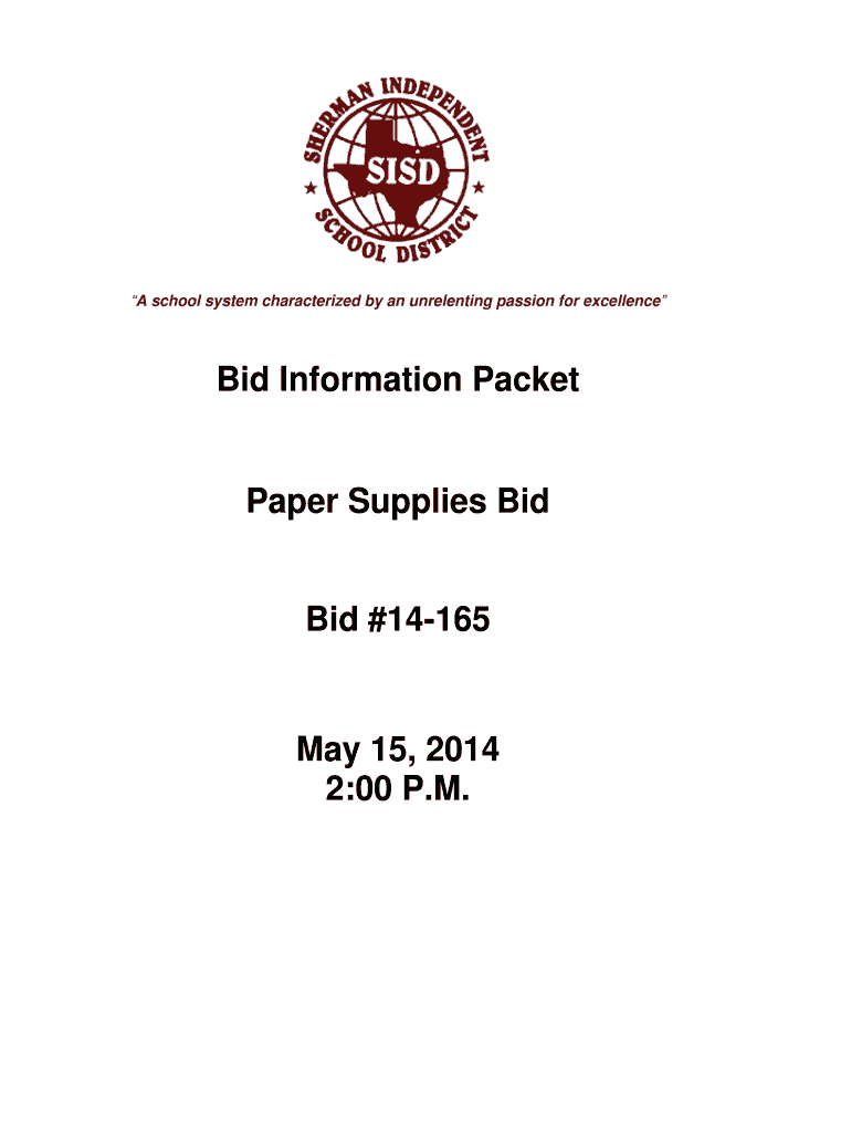 A school system characterized by an unrelenting passion for excellence Information PacketPaper Supplies Ibid #14165May 15, 2014 2:00 P.M.PROPOSAL INFORMATION PAGE PAPER SUPPLIES BID #14165RUN ADVERTISEMENT: