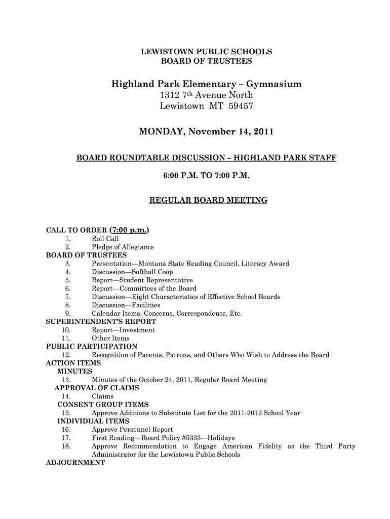 LEWISTON PUBLIC SCHOOLS BOARD OF TRUSTEESHighland Park Elementary Gymnasium 1312 7th Avenue North Lewiston MT 59457 MONDAY, November 14, 2011, BOARD ROUNDTABLE DISCUSSION HIGHLAND PARK STAFF 6:00
