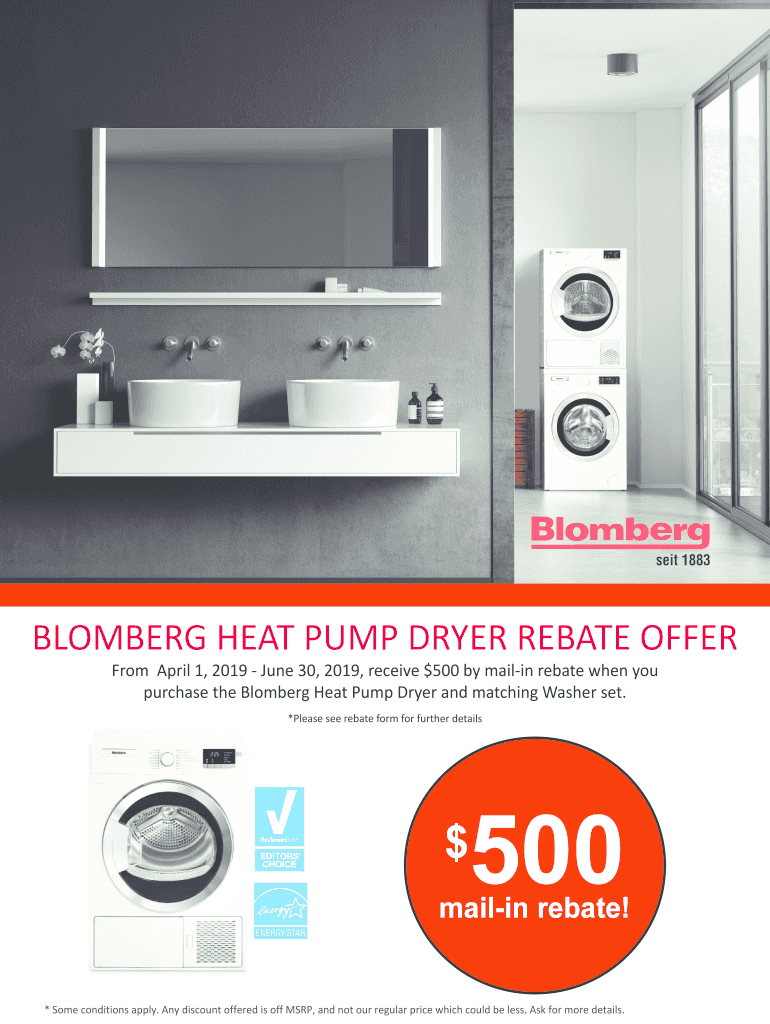 BLOOMBERG HEAT PUMP DRYER REBATE OFFER From April 1, 2019, June 30, 2019, receive $500 by mailing rebate when you purchase the Bloomberg Heat Pump Dryer and matching Washer set. *Please see rebate