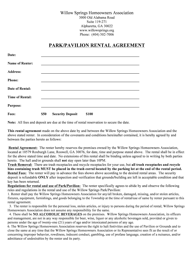 Willow Springs Homeowners Association 3000 Old Alabama Road Suite 119271 Alpharetta, GA 30022 www.willowsprings.org Phone: (404) 5027006PARK/PAVILION RENTAL AGREEMENT Date: Name of Renter: Address:
