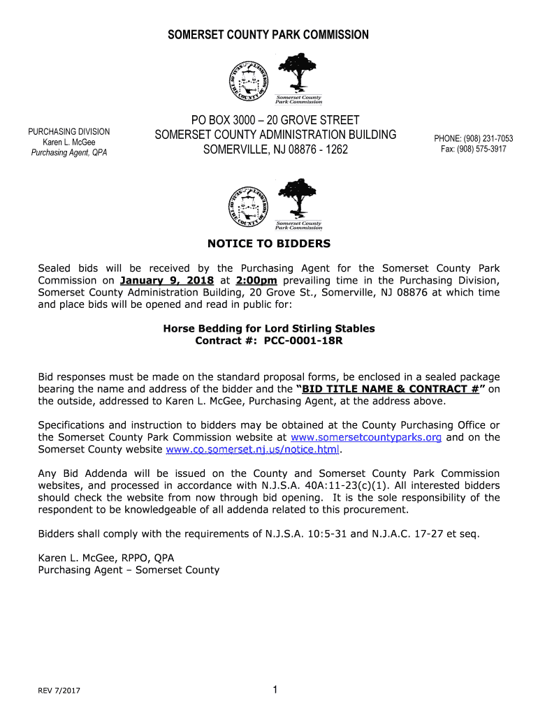 SOMERSET COUNTY PARK COMMISSIONPURCHASING DIVISION Karen L. McGee Purchasing Agent, CAPO BOX 3000 20 GROVE STREET SOMERSET COUNTY ADMINISTRATION BUILDING SOMERVILLE, NJ 08876 1262PHONE: (908) 2317053