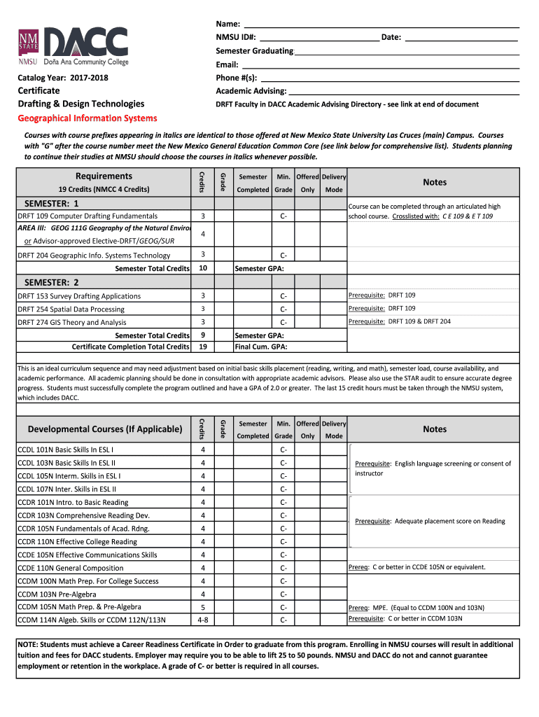 Name: MSU ID#: Date: Semester Graduating: Email: Phone #(s): Academic Advising: Catalog Year: 20172018Certificate Drafting & Design Technologies Geographical Information SystemsDRFT Faculty in DAC