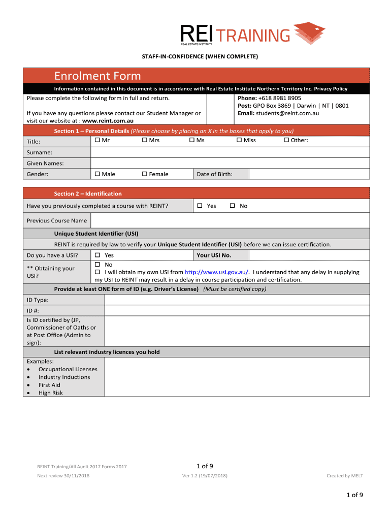 STAFFINCONFIDENCE (WHEN COMPLETE)Enrollment Form Information contained in this document is in accordance with Real Estate Institute Northern Territory Inc. Privacy PolicyPlease complete the following