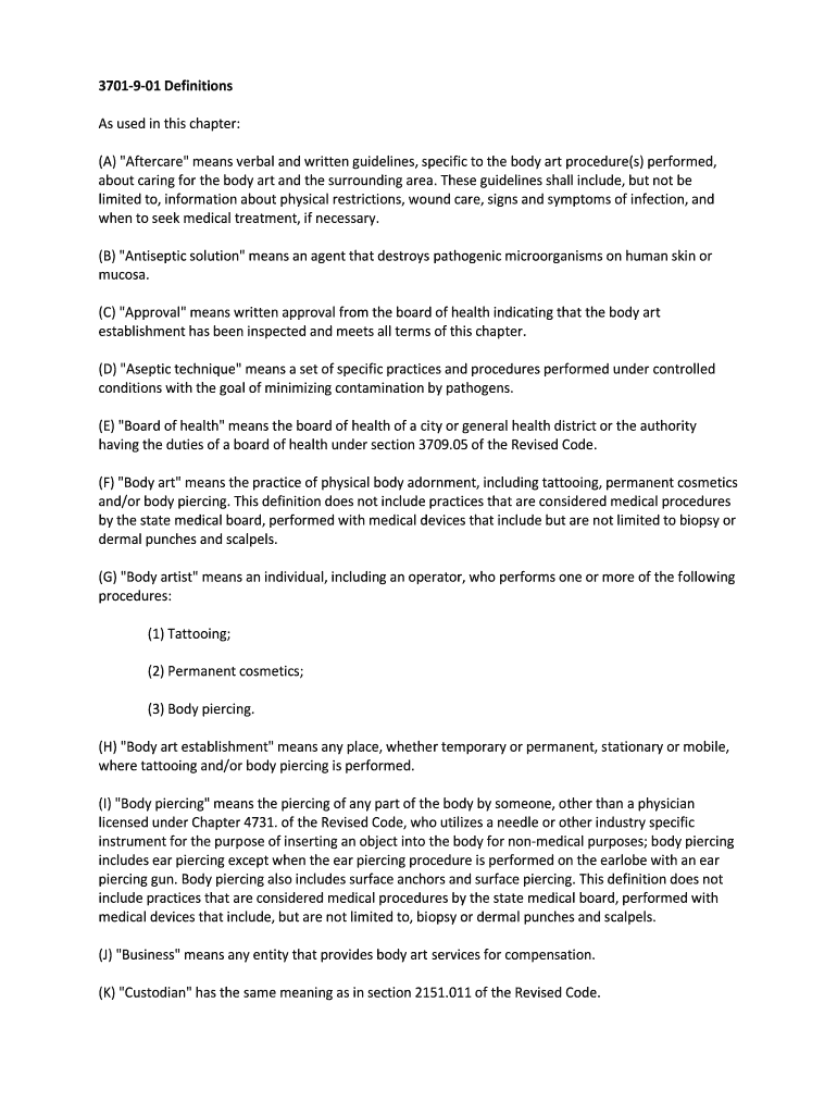 3701901 Definitions As used in this chapter: (A) “Aftercare means verbal and written guidelines, specific to the body art procedure(s) performed, about caring for the body art and the surrounding