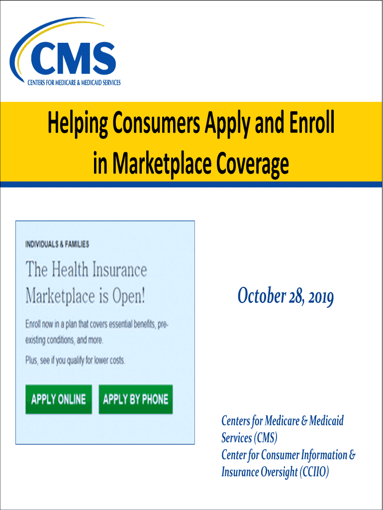 Helping Consumers Apply and Enroll in Marketplace Coverage October 28, 2019Centers for Medicare & Medicaid Services (CMS) Center for Consumer Information & Insurance Oversight (CAIRO)Disclaimer The