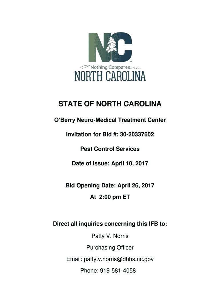 STATE OF NORTH CAROLINA Berry Neurological Treatment Center Invitation for Bid #: 3020337602 Pest Control Services Date of Issue: April 10, 2017Bid Opening Date: April 26, 2017, At 2:00 pm Direct