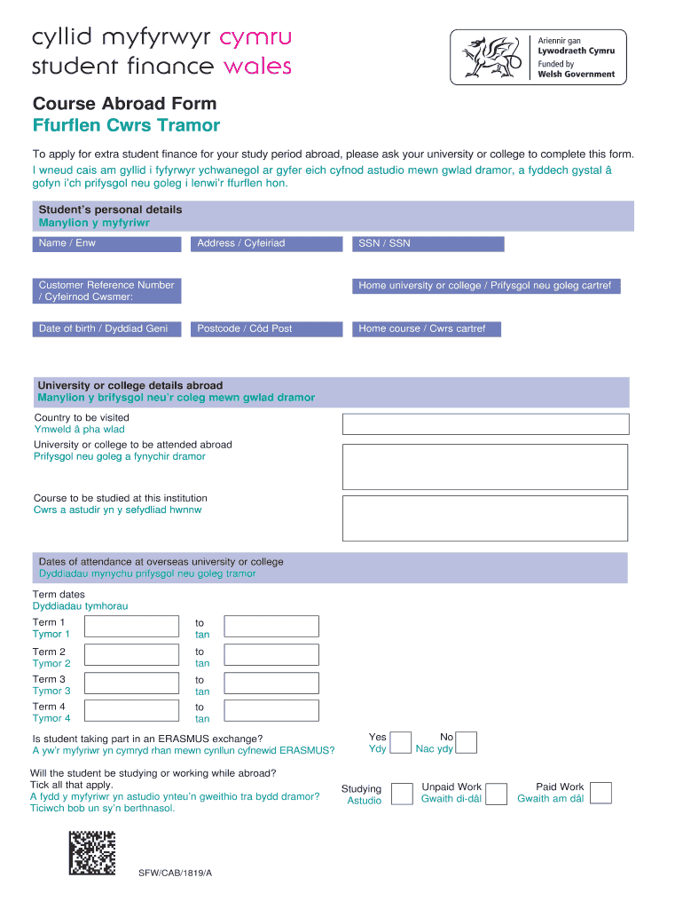 Get the free Course Abroad Form Ffurflen Cwrs ... - Student Finance Wales