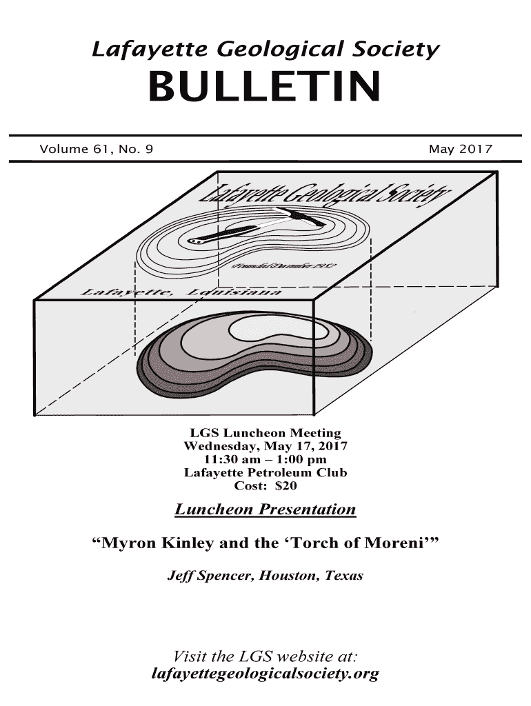 Lafayette Geological SocietyBULLETIN Volume 61, No. 9May 2017LGS Luncheon Meeting Wednesday, May 17, 2017 11:30 am 1:00 pm Lafayette Petroleum Club Cost: $20Luncheon Presentation Myron Kinda and the